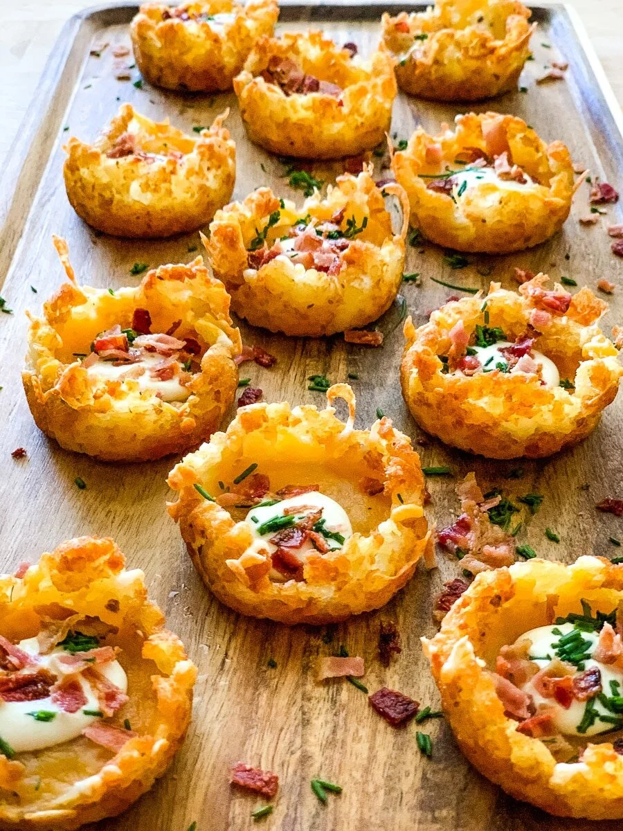 Creamy, crunchy, and cheesy… these Loaded Tater Tots have it all! Filled with sour cream, bacon bits, shredded cheese and chives, this creative finger food is the perfect hand held treat. Step by step instructions from The Feathered Nester makes this recipe simple. Grab your muffin tin, bake the tots, add the filling, bake again, and enjoy the crunch!