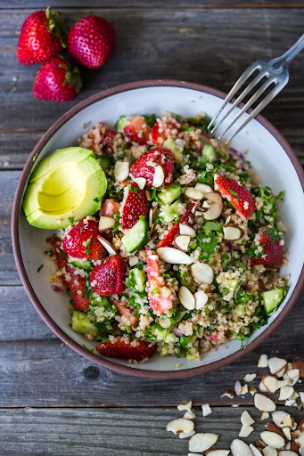 Spring into the season with a bright and colorful strawberry tabouli. This recipe is completely vegan and in just a few steps, you will have a refreshing meal that will make you feel berry good from the inside out! The flavors of strawberry, cucumber, quinoa, and mint will have you welcoming the warmer weather with open arms.