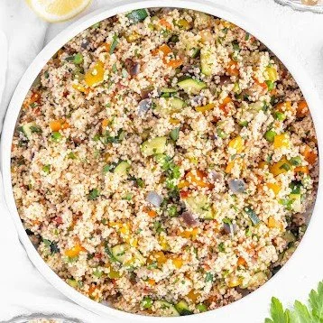 This Vegetable Couscous Salad is perfect for any time because it's packed with filling ingredients such as eggplant, zucchini and bell peppers. The star of the dish is the Moroccan couscous that pairs beautifully with all the sauteed and seasoned vegetables. The best part about this recipe is that it is flexible, you can add or substitute ingredients to build the perfect dish.